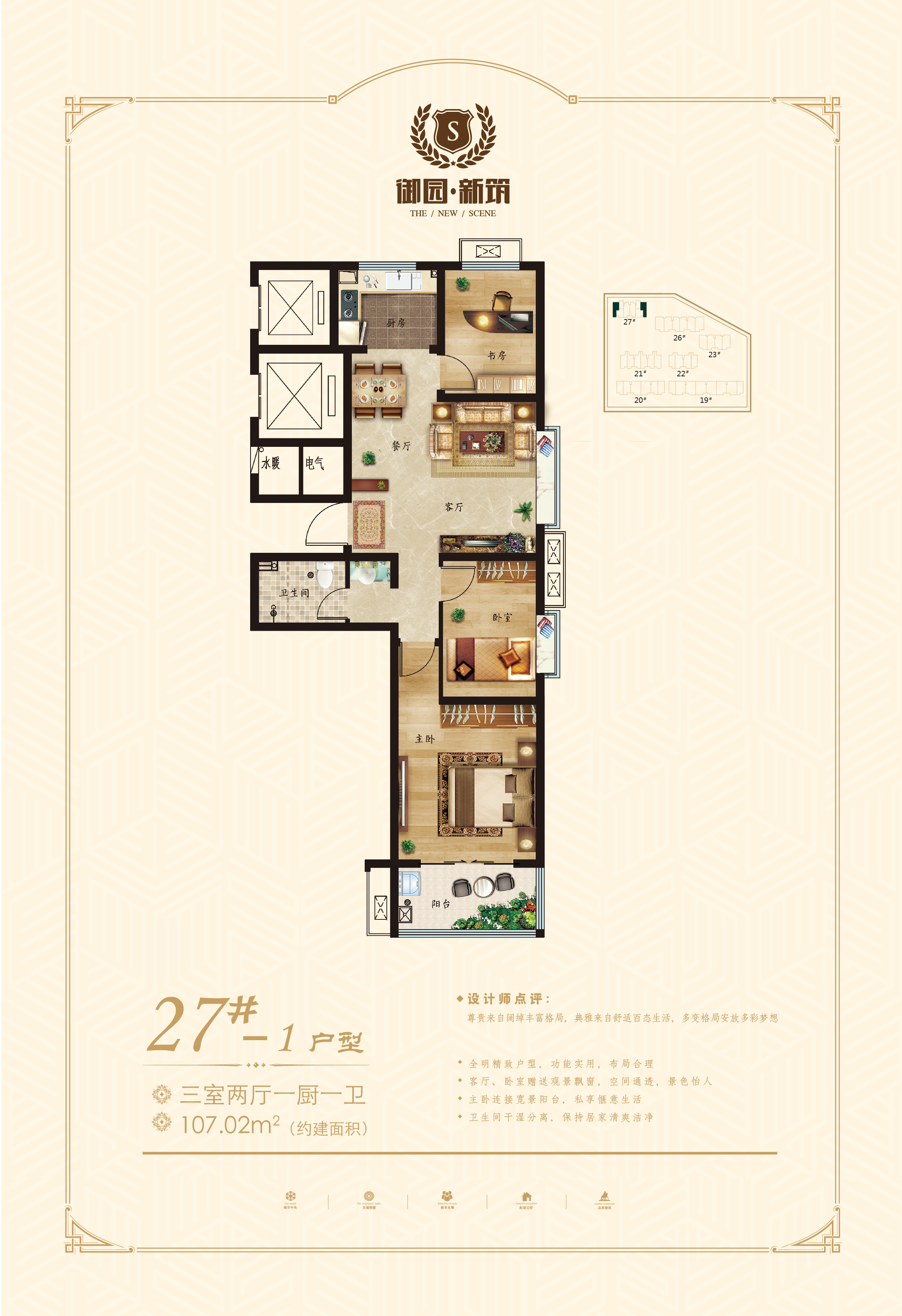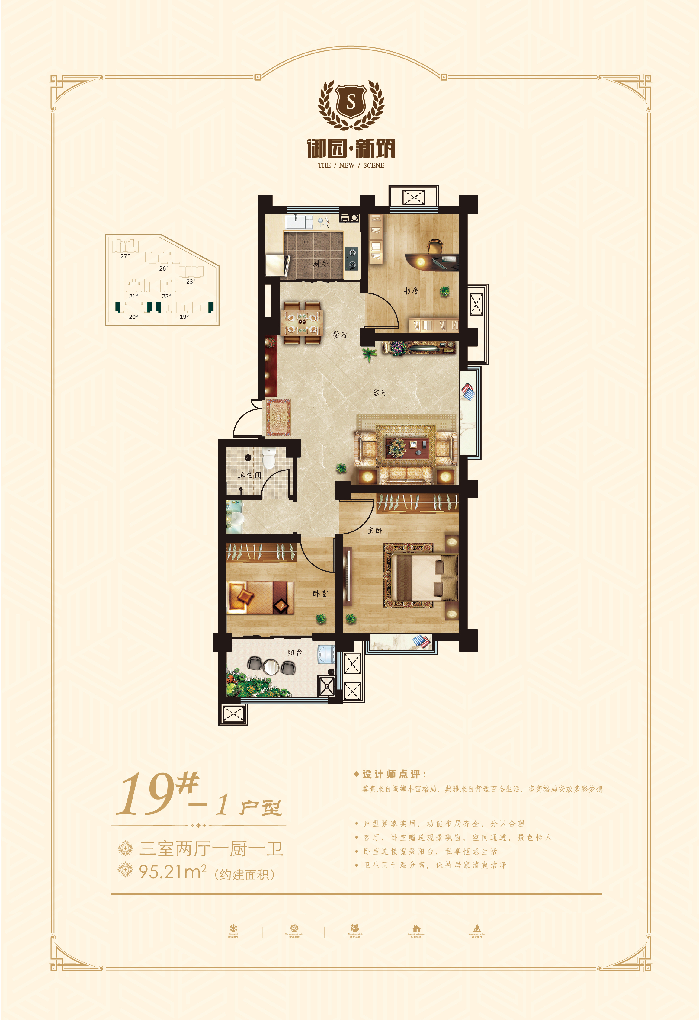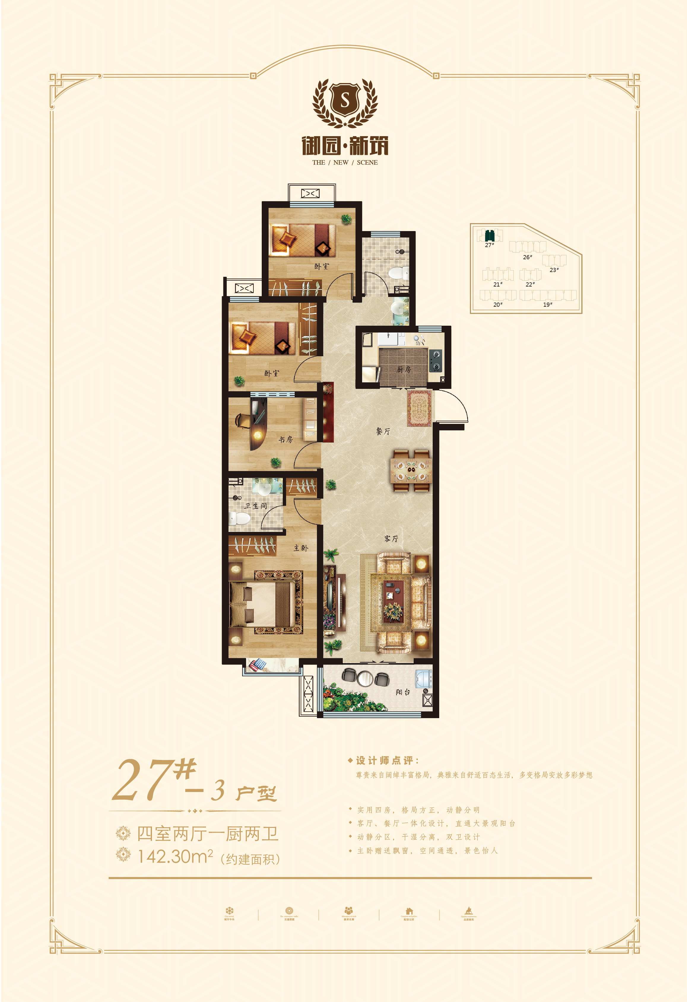 御园新筑位于北园路与蒙山大道交汇东行100米路南,总占地25177.45㎡,总建筑面积60561.1 ㎡,是集洋房、小高、高层、沿街商铺于一体的匠心之作。(建面约)90-150㎡户型面积区间、精致实用高层、宽敞明亮小高、典雅品质洋房,匠心营造高端品质之作。北园路、高架东 、大润发南,丰富教育资源、一站式五分钟生活圈,全系繁华配套满足您全面的生活需求。